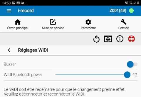 Les réglages du WiDI se trouvent sous les réglages généraux, qui peuvent être ouverts via le menu. Les deux valeurs "Buzzer" et "WiDI Bluetooth Power" ne peuvent être lues et modifiées que si l'application est connectée à un WiDI.